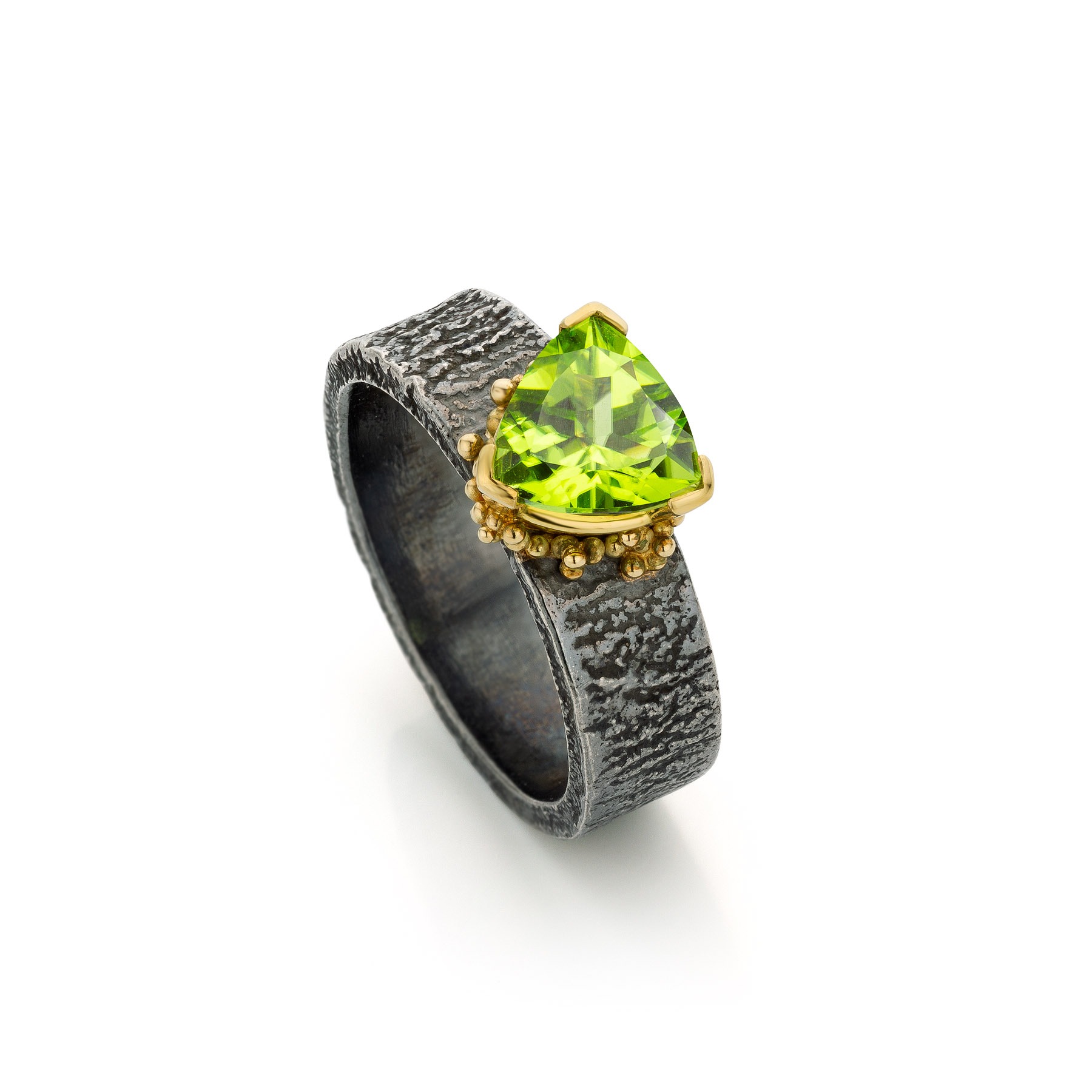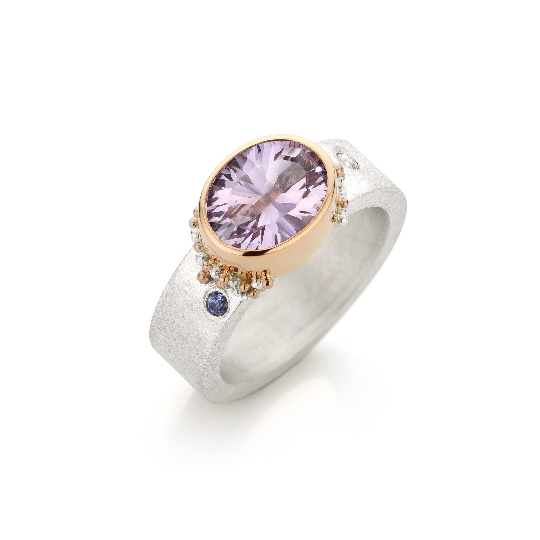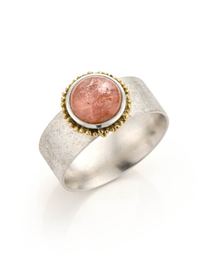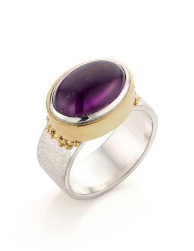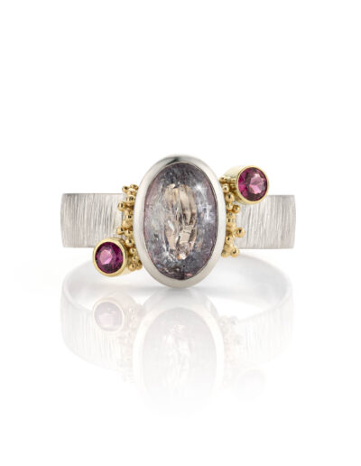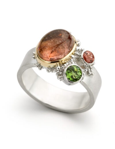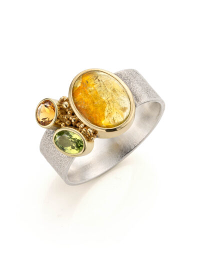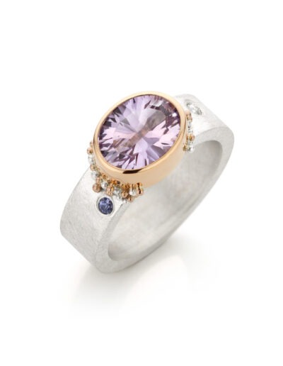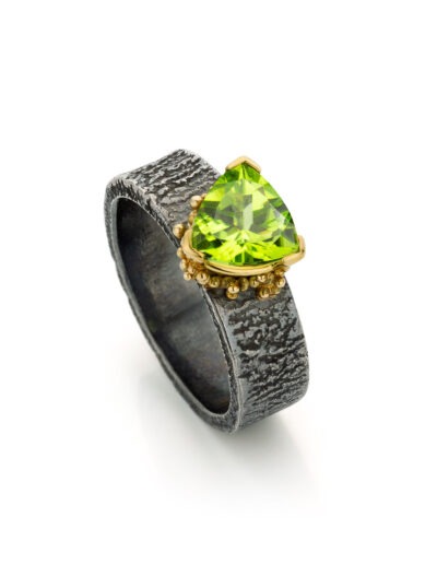 In die periode ontdekte ik hoe sterk de combinatie van zilver en goud kan zijn. Gezwart zilver waarop gouden granules er echt uit poppen. Een zilveren ring met een duidelijke structuur en een gouden zetting waardoor een edelsteen sterker naar voren komt. Dat contrast maakte het ontwerp.