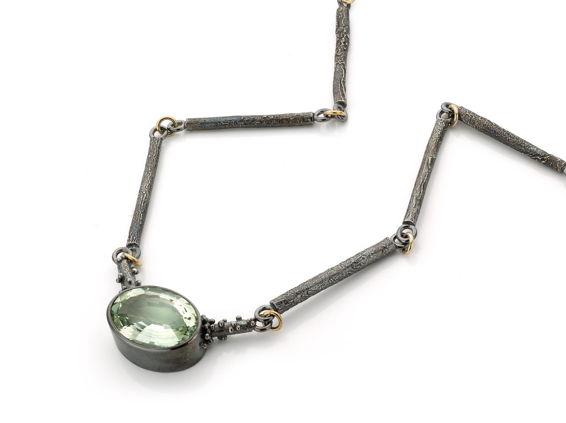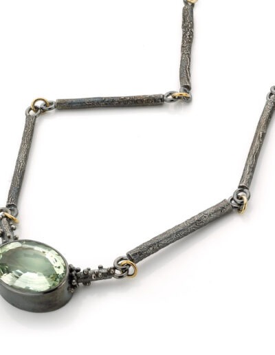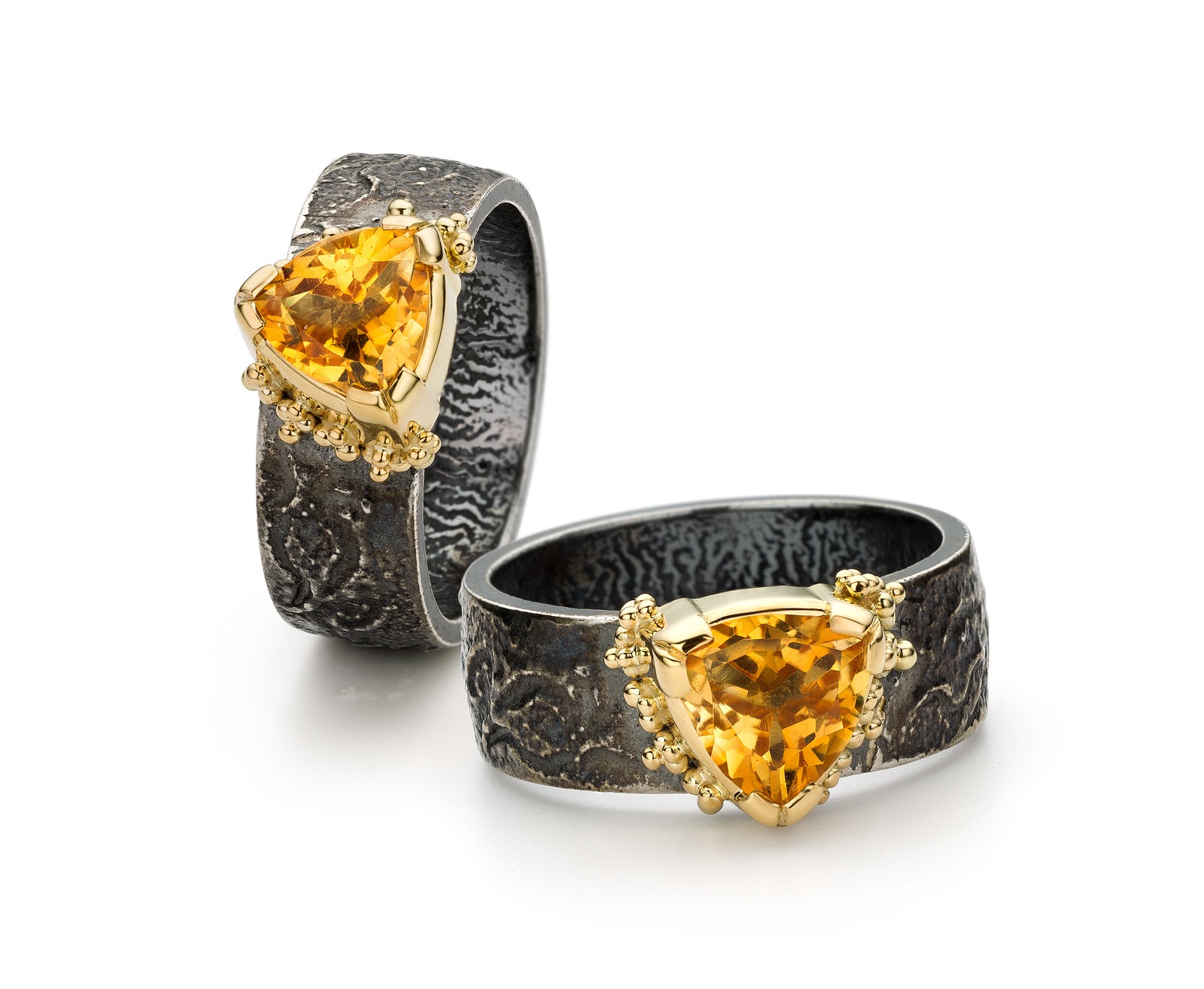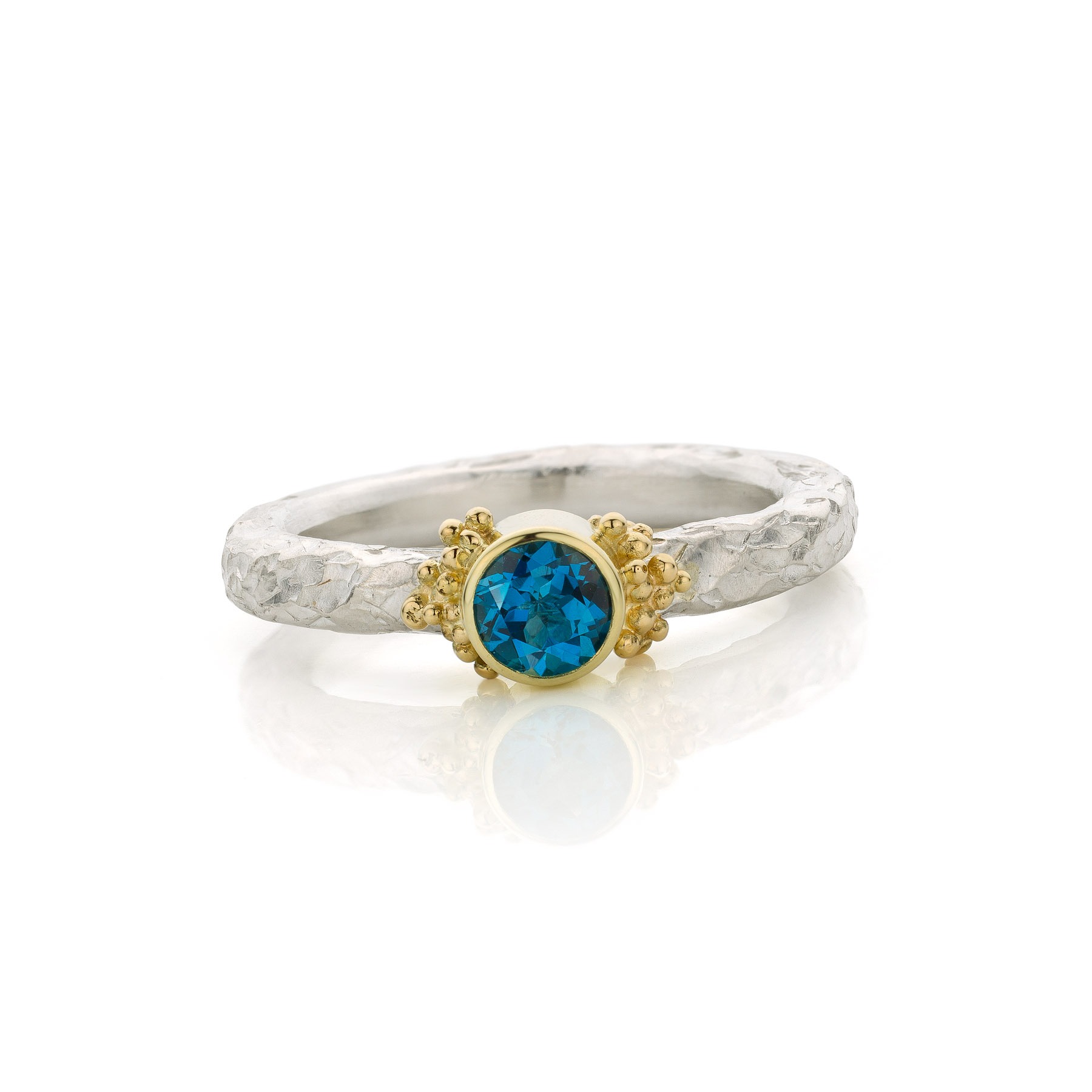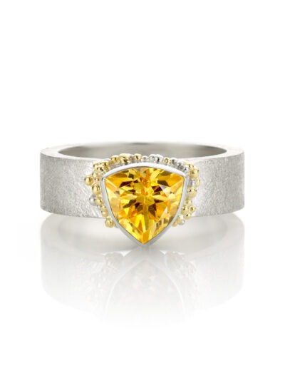 In die periode ontdekte ik hoe sterk de combinatie van zilver en goud kan zijn. Gezwart zilver waarop gouden granules er echt uit poppen. Een zilveren ring met een duidelijke structuur en een gouden zetting waardoor een edelsteen sterker naar voren komt. Dat contrast maakte het ontwerp.