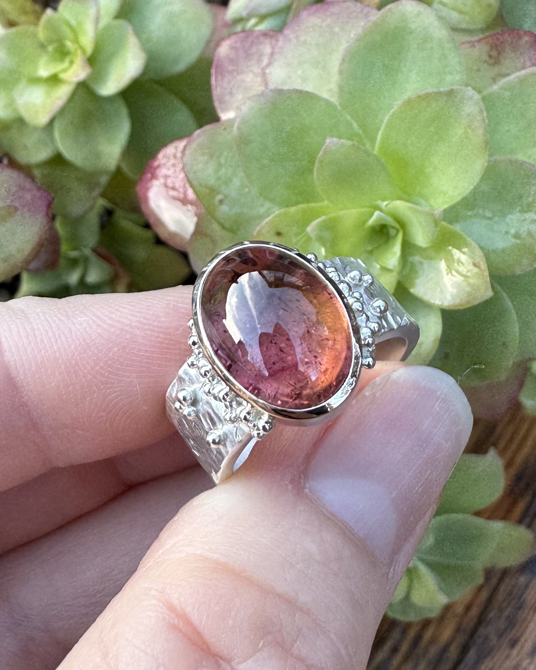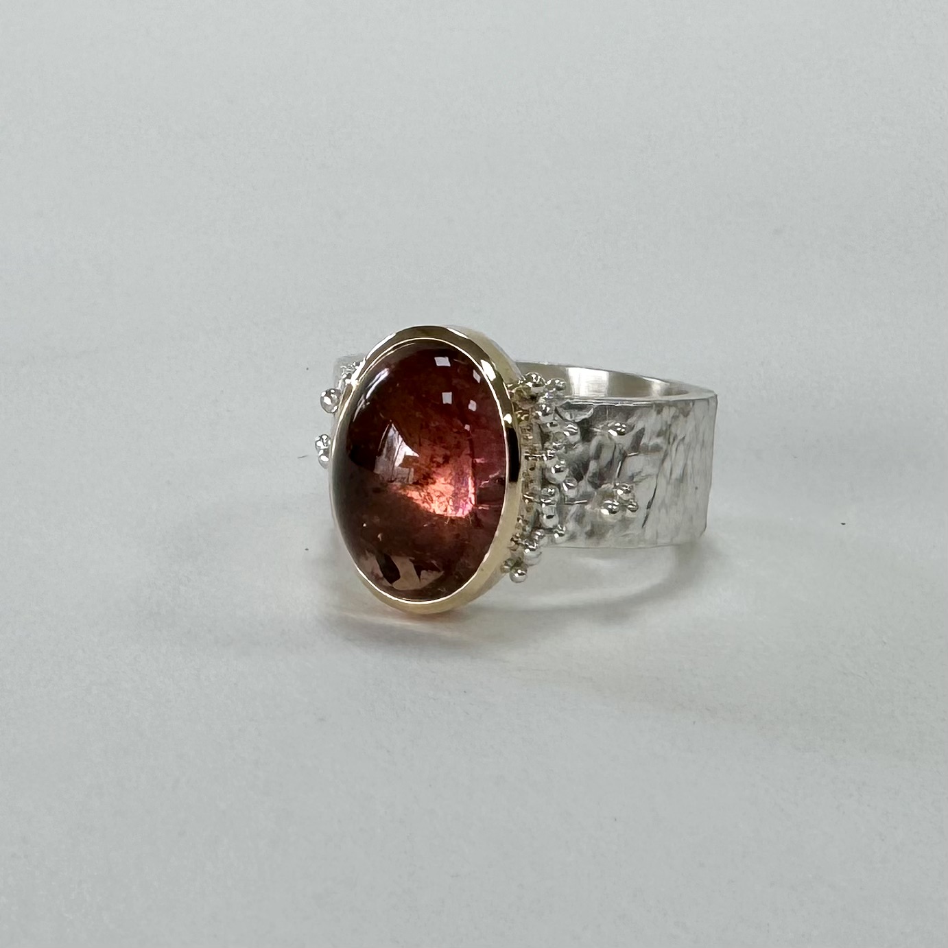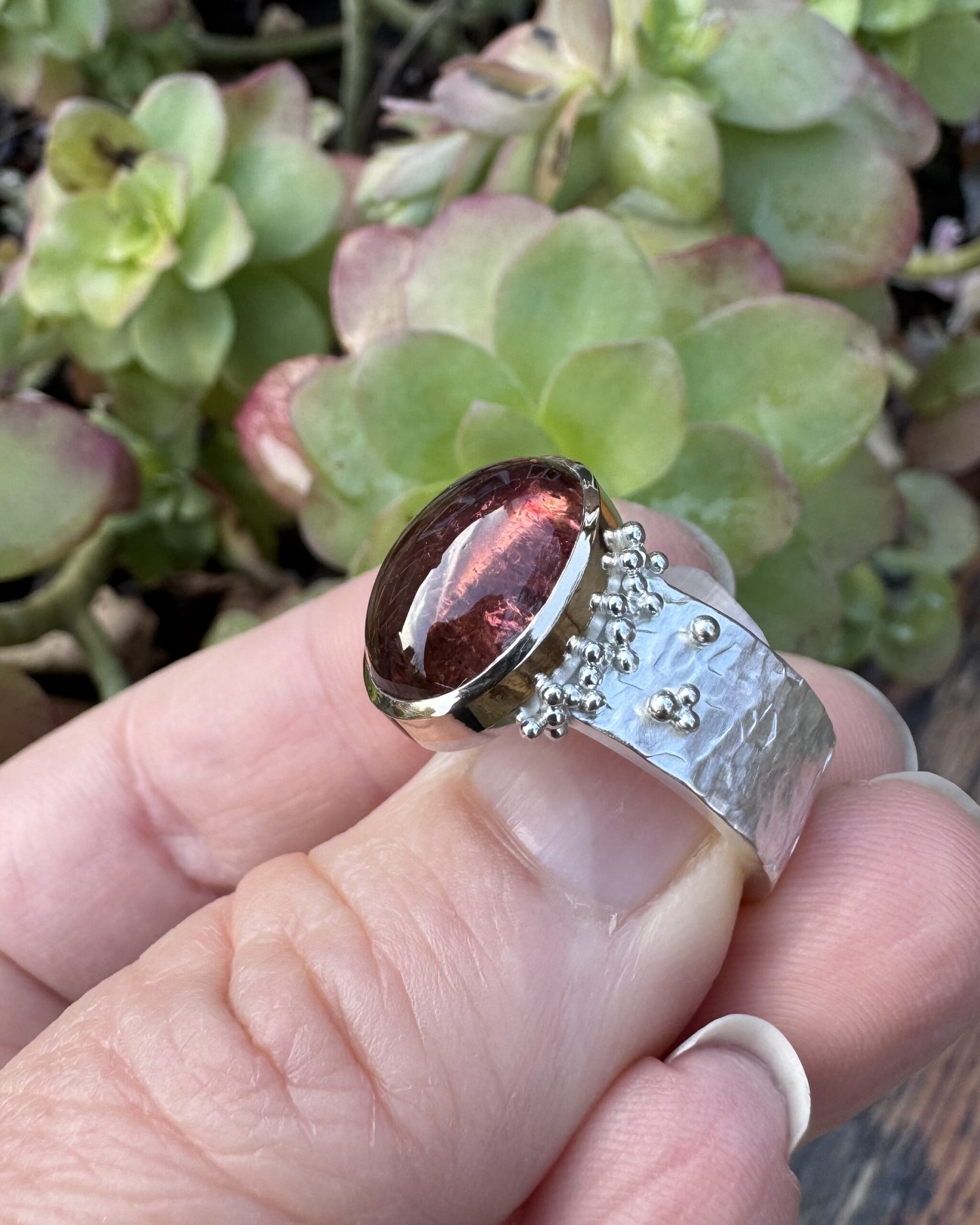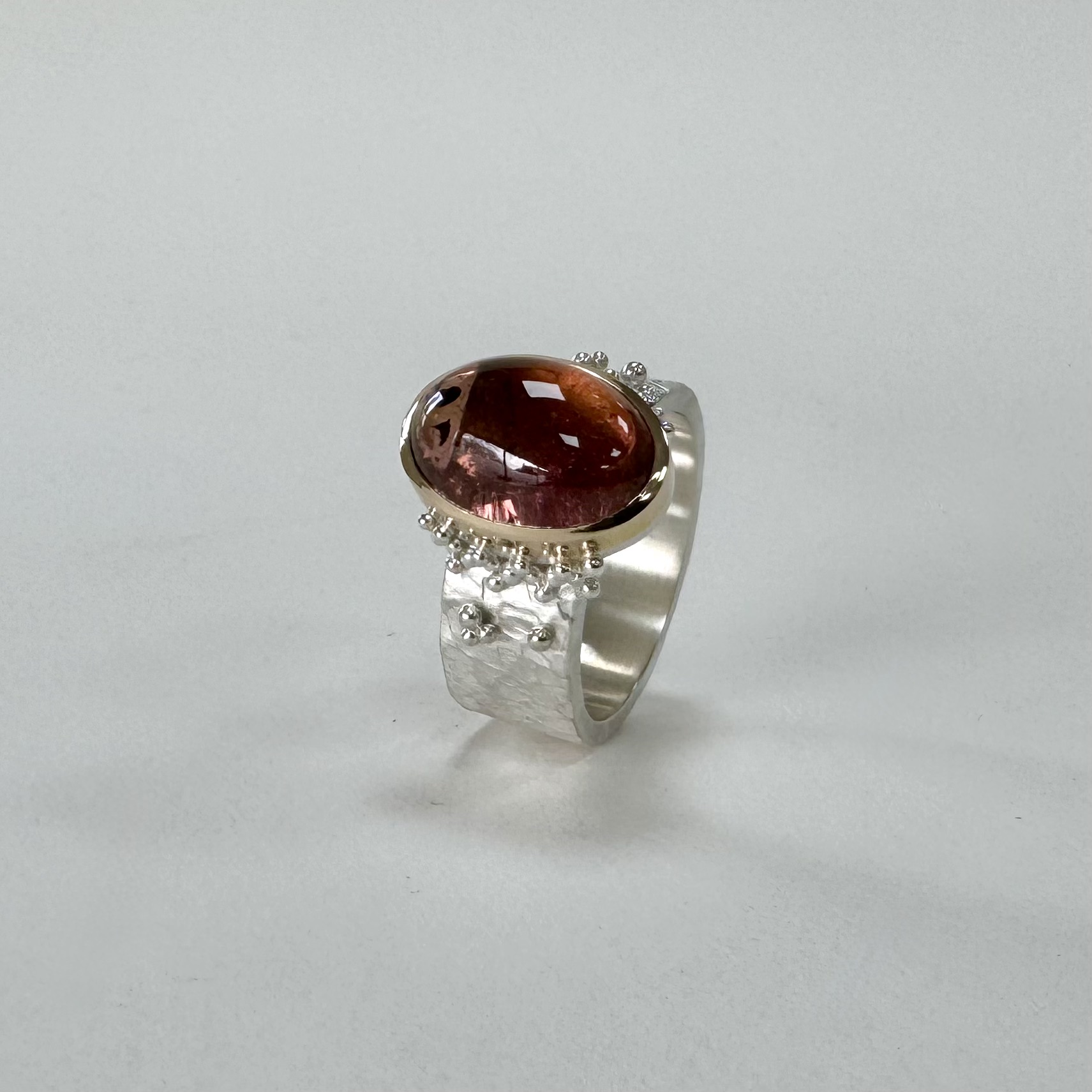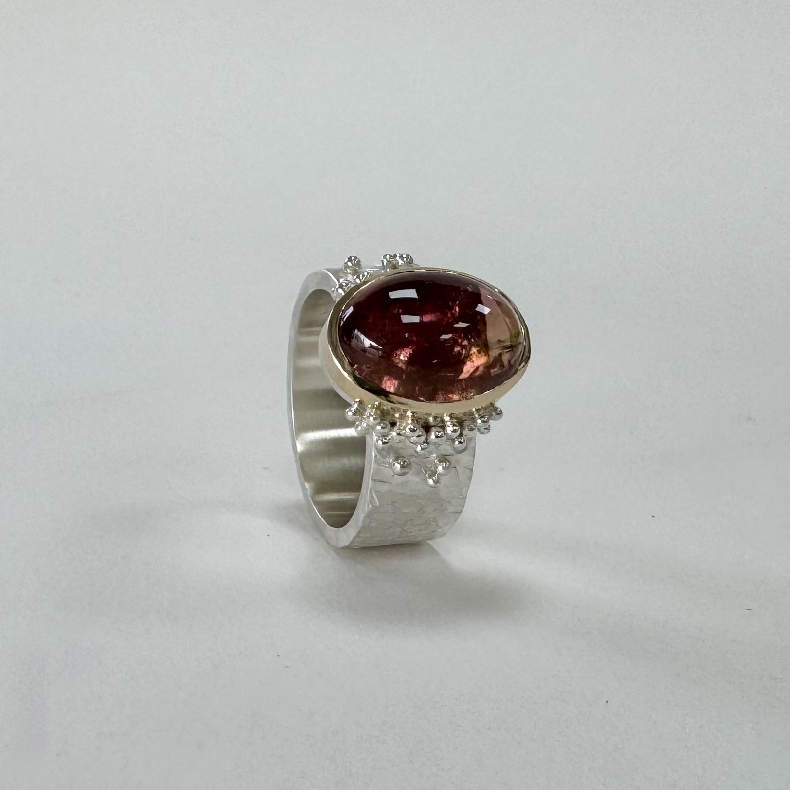 De ring is vervaardigd uit zilver met een gehamerd oppervlak en heeft een stevige basis die zorgt voor draagcomfort en een solide uitstraling. De toermalijn is gezet in een zetrand van 14kt roségoud, bewust gekozen om de levendige tinten in de edelsteen te versterken. Langs de zetkast zijn mijn kenmerkende granules geplaatst, subtiel maar onmiskenbaar aanwezig als vast onderdeel van mijn signatuur.