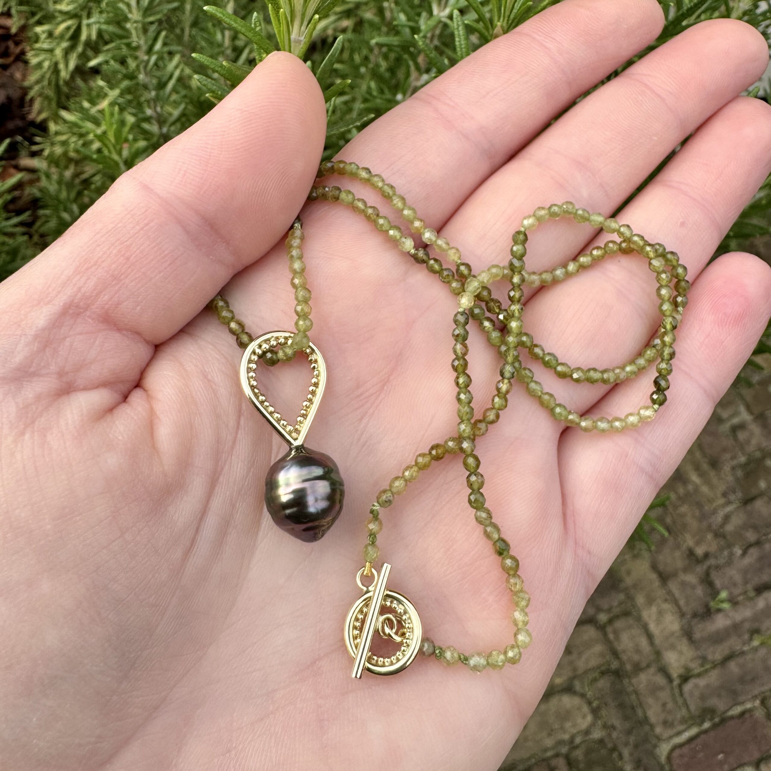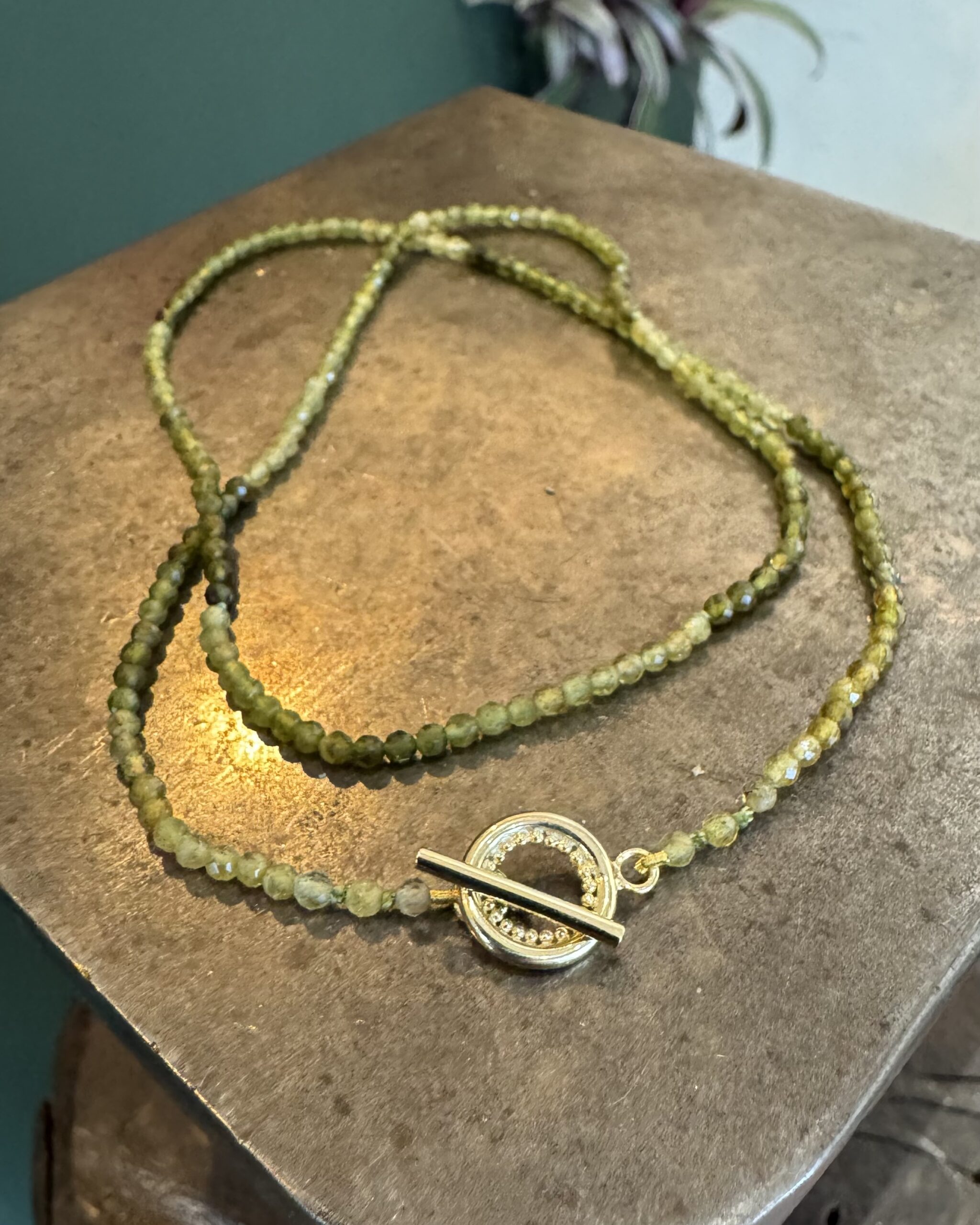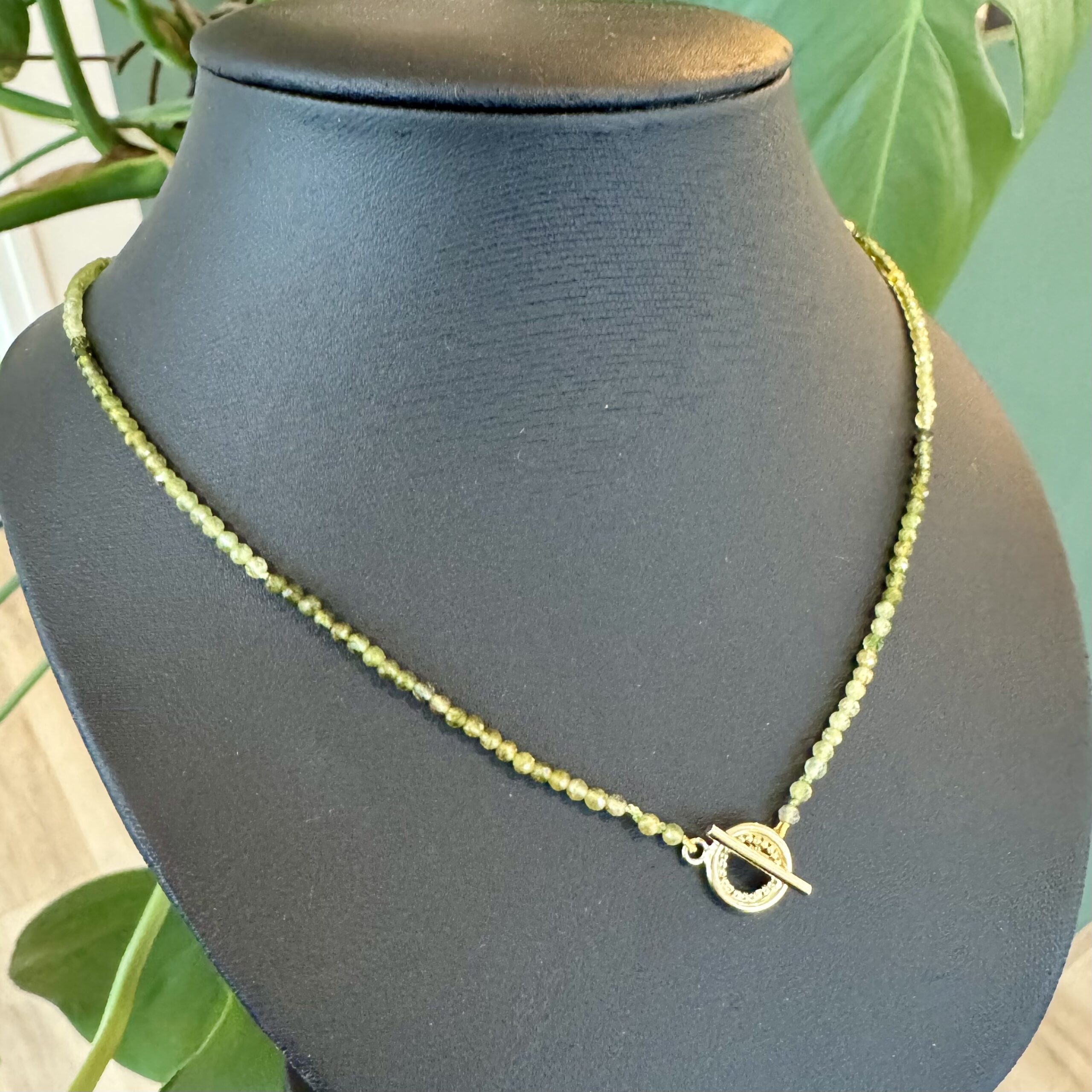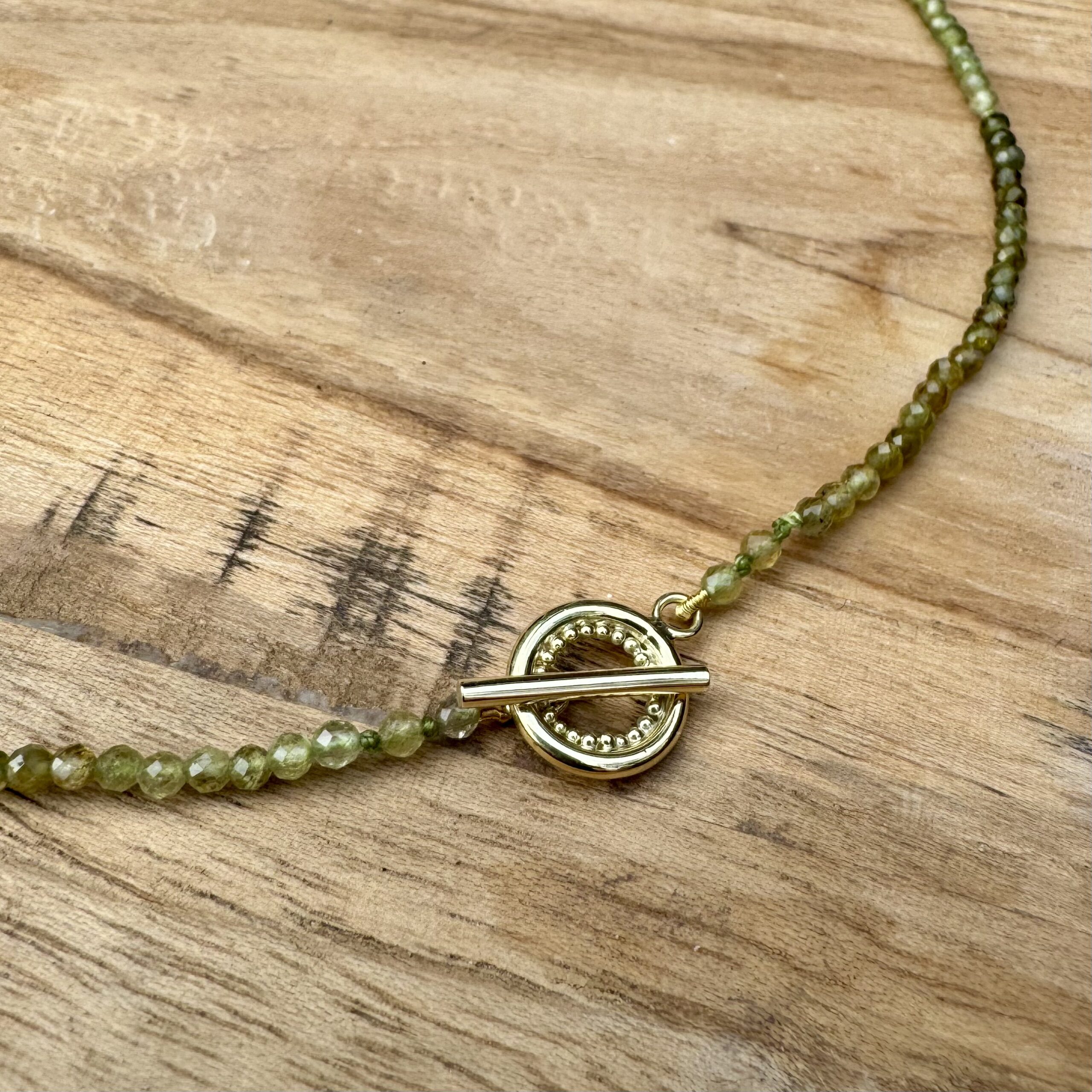 Green tourmaline necklace with handmade 14kt yellow gold chapel clasp