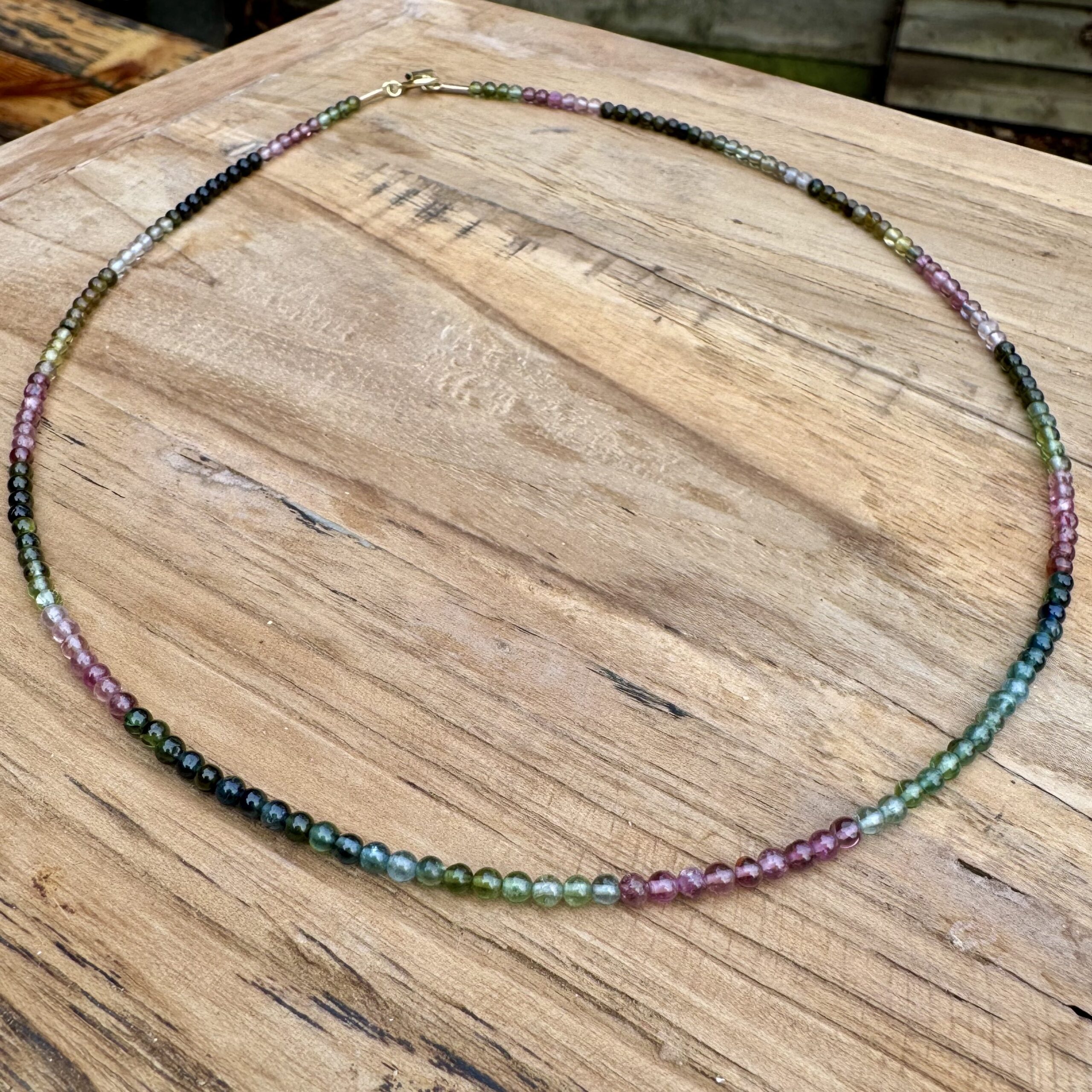 This necklace is made of carefully selected green tourmaline gemstones measuring approximately 2.5 mm. The gemstones are knotted on stringing thread, with the necklace having a repeating pattern of small sets that progress from light green to dark green each time. This repetition creates a vibrant and harmonious color pattern that gives the necklace its special look. The total length is 46 cm, including the handmade adornment clasp.
