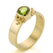 The tourmaline is set in an 18ct yellow-gold ring and has granules next to the gemstone. Not too many frills, no extra gemstones or pearls. Just this one single extraordinarily beautiful quality green tourmaline.